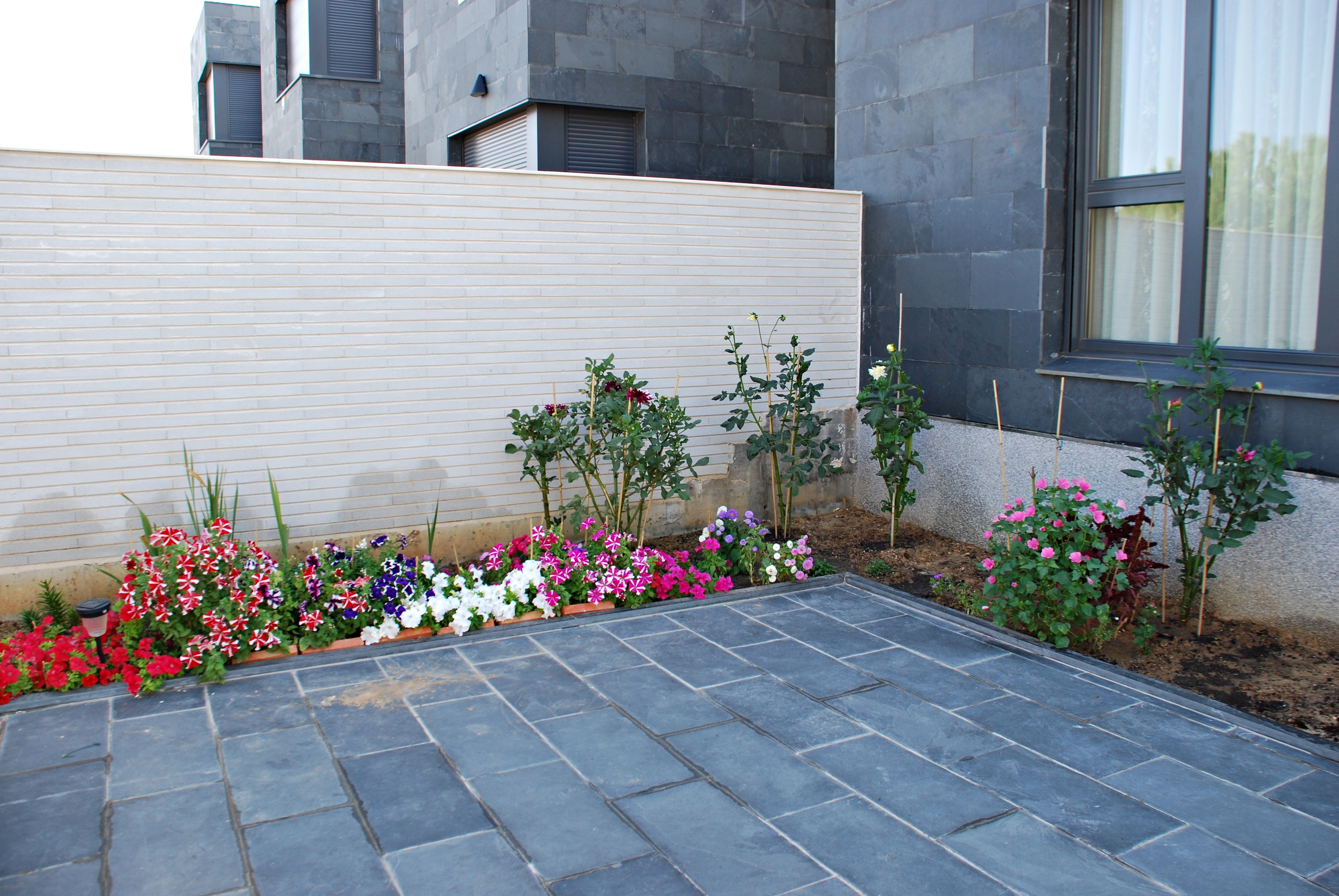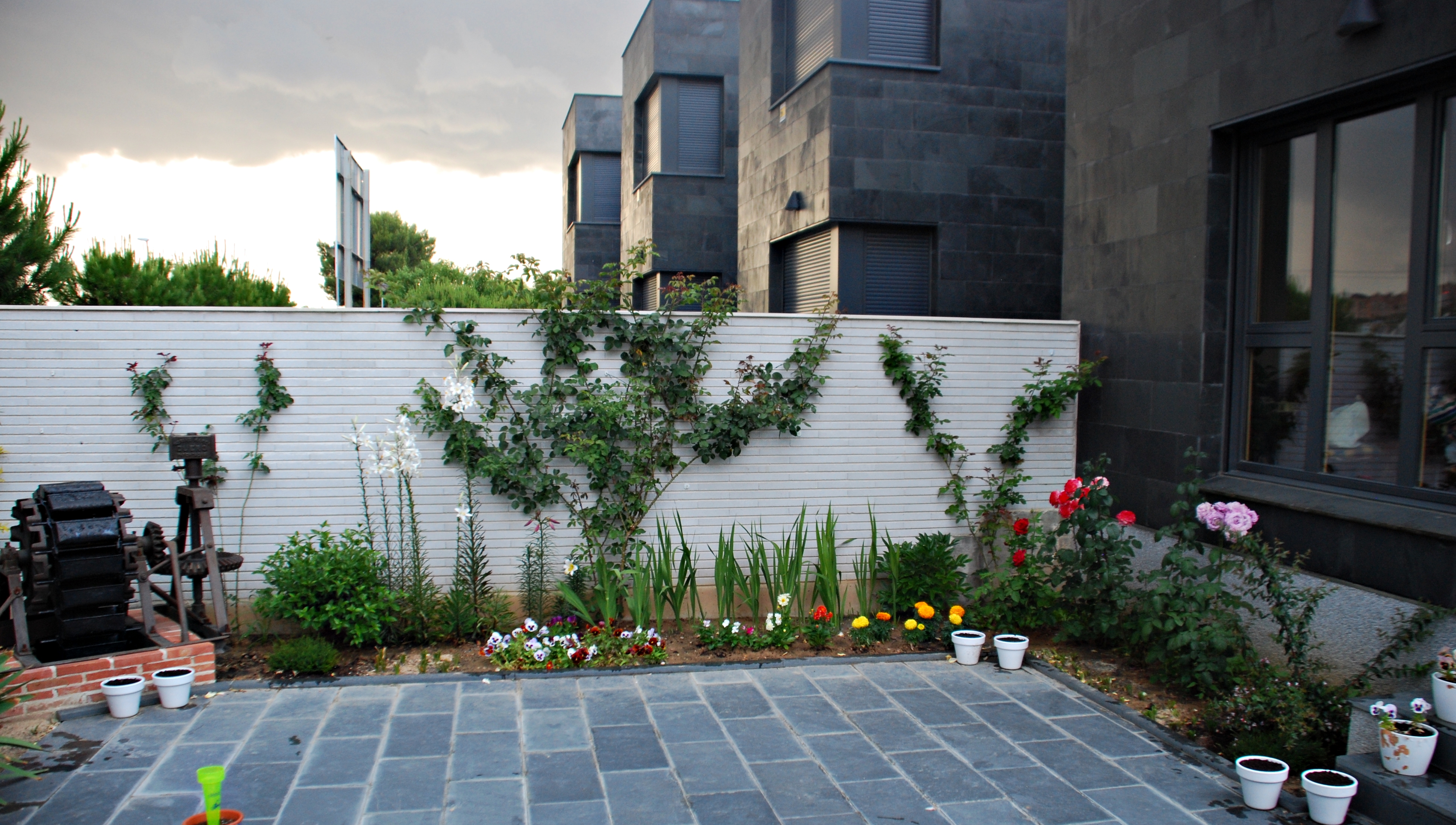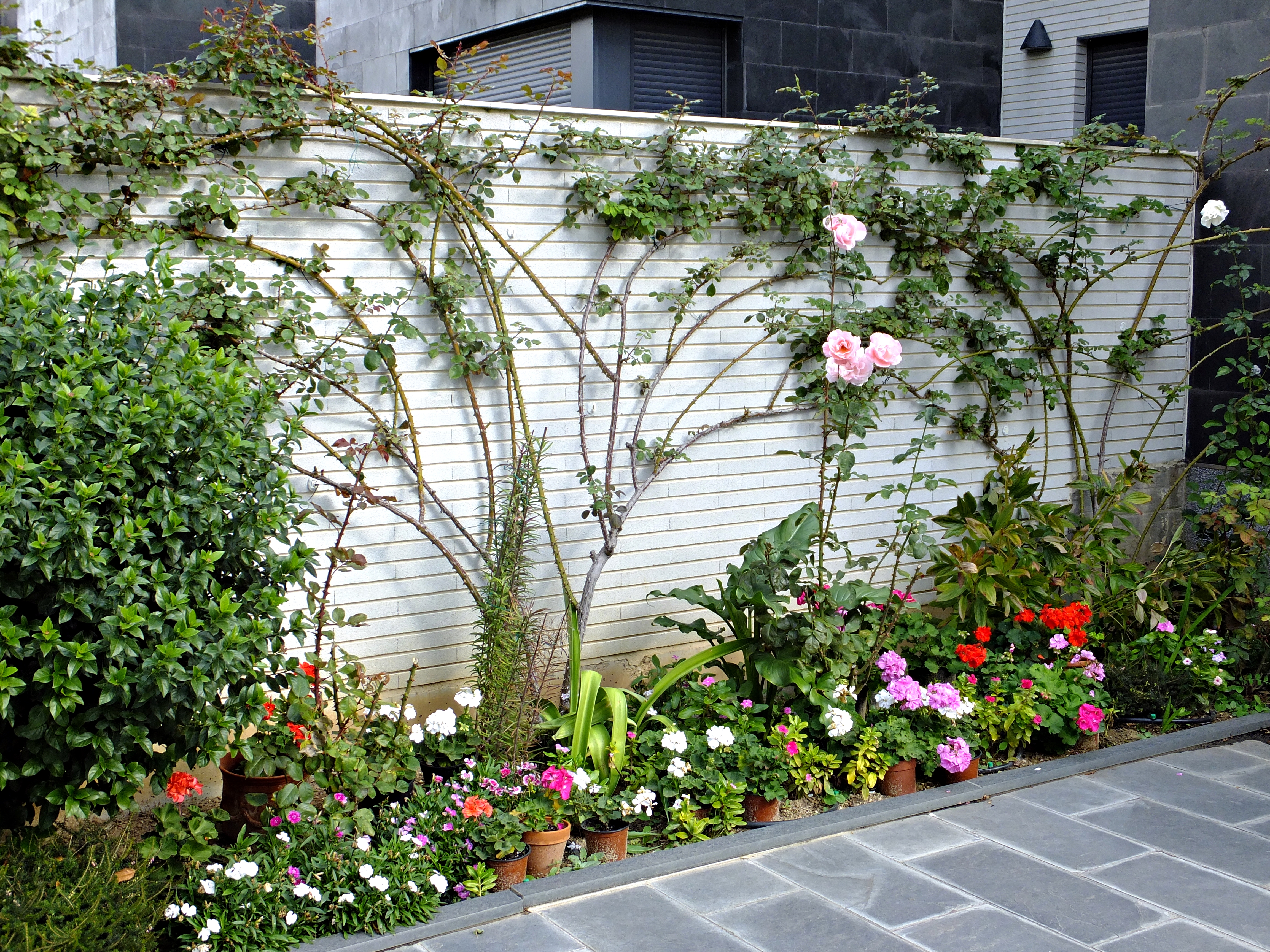 El patio exterior de nuestra casa es un pequeño espacio de unos 70 metros cuadrados en el que una tercera parte está dedicada al cultivo de plantas en el terreno y además un montón de macetas dispersas por el resto.