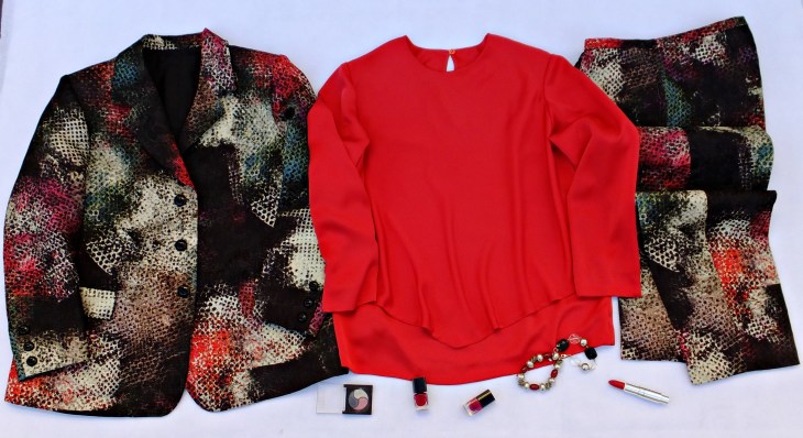 Un traje pantalón puede ser muy serio y clásico, pero si le ponemos un tejido divertido, un brocado en camuflaje de colores, todo cambia. Y más si se acompaña con un blusón rojo. Alegre.