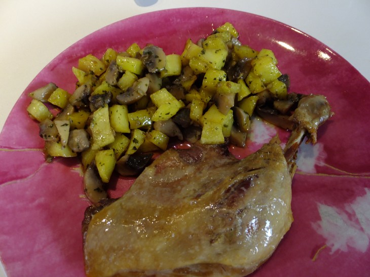 - Mientras tanto preparamos el salteado de patatas con champiñones según la receta. Se puede preparar con grasa de pato, pero yo prefiero el aceite de oliva, será menos francés pero más sano.