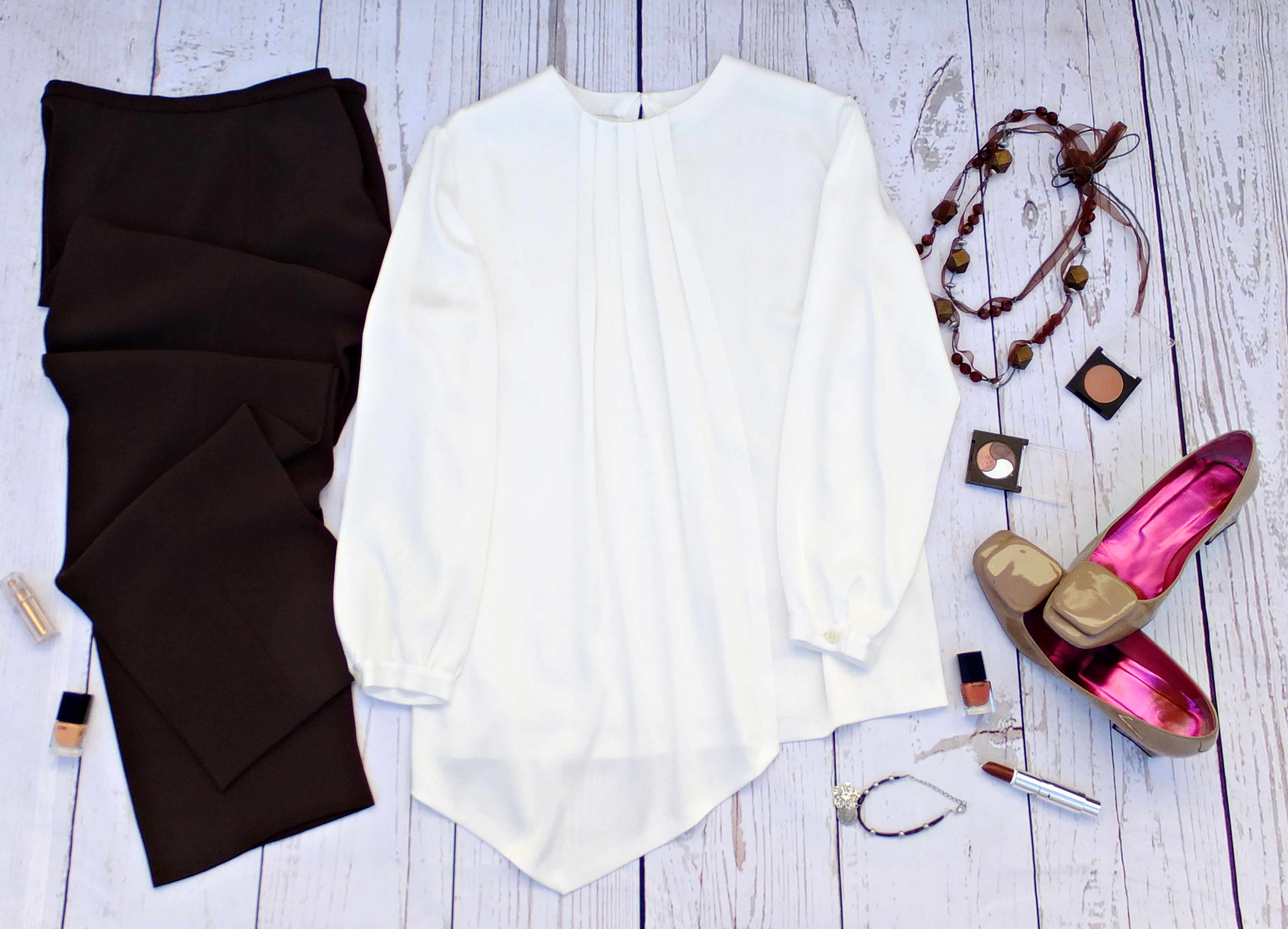 Un buen pantalón marrón con un vistoso blusón color crema es un conjunto estupendo para el otoño e invierno. Para trabajar, para ir de paseo, de compras, para cualquier momento.