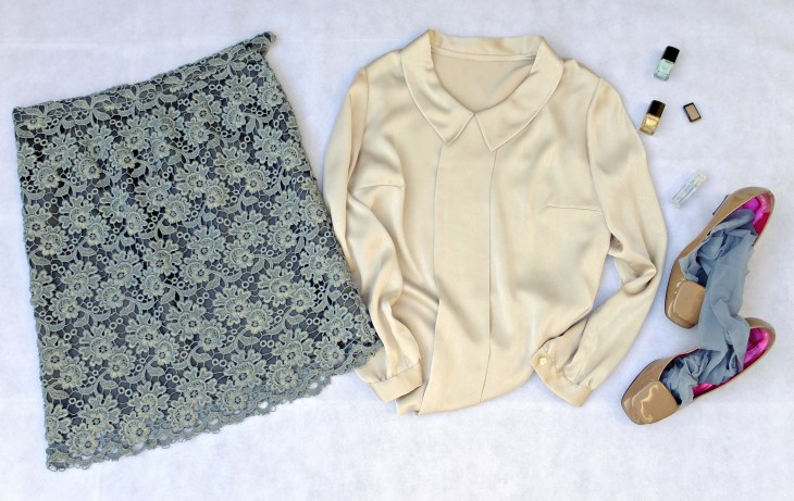 Una falda en guipur azul con hilos dorados y una blusa crema quedan perfectos para cualquier ocasión especial. Intemporal.