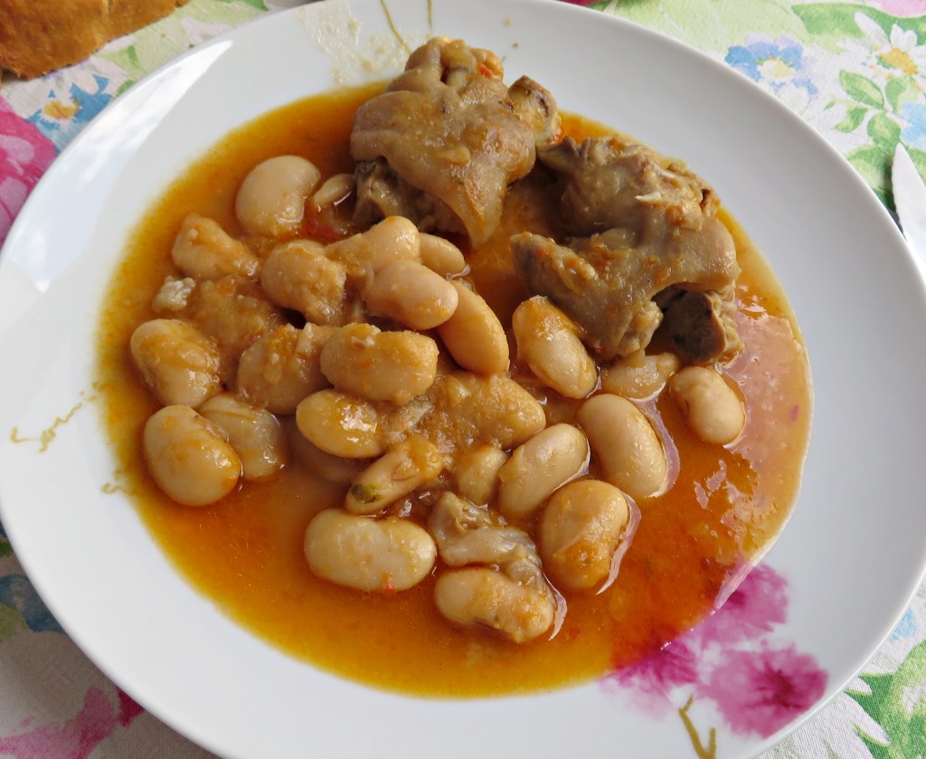 Las patas, o manos de cerdo, guisadas con alubias blancas no forma parte de mi recetario sino de la familia de mi marido. Nunca las he tomado en su casa, pero como insiste que le gustan mucho he tenido que crear un plato a partir de lo que me ha parecido apropiado.