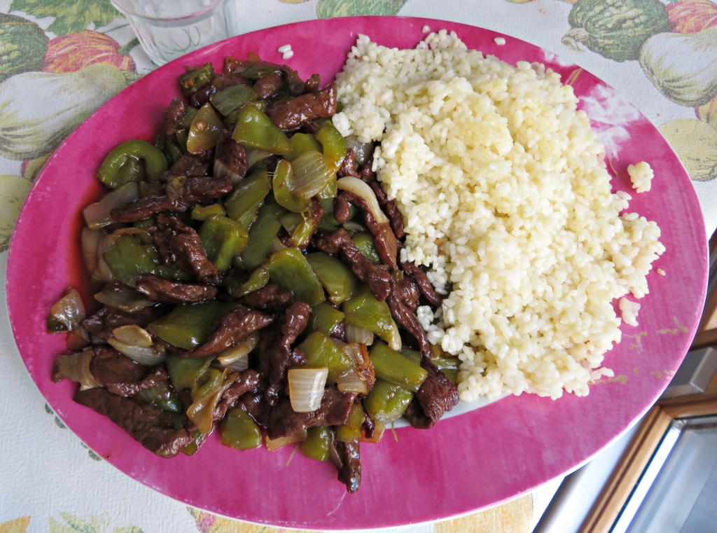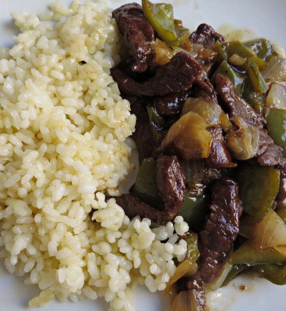 - Sirve en una fuente grande, a un lado el arroz y al otro, la carne con las verduras.
