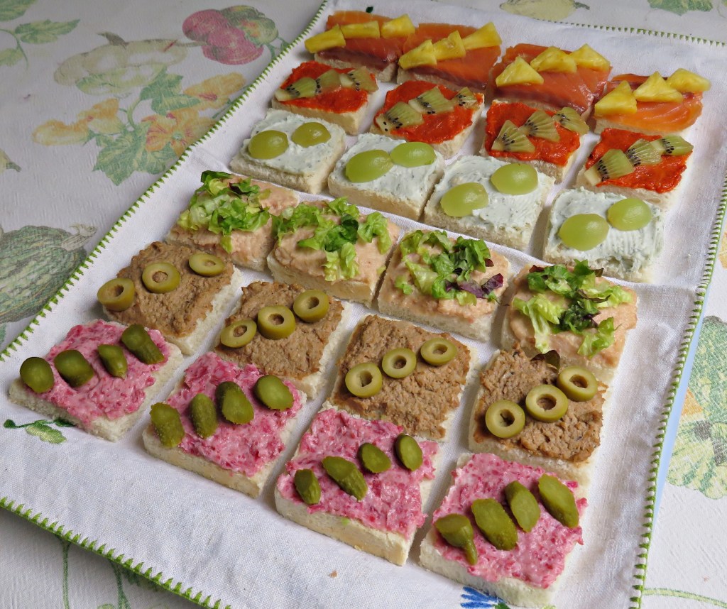 - Salmón – untamos el pan con mantequilla, ponemos encima una loncha de salmón ahumado o marinado y adornamos con triángulos de piña.