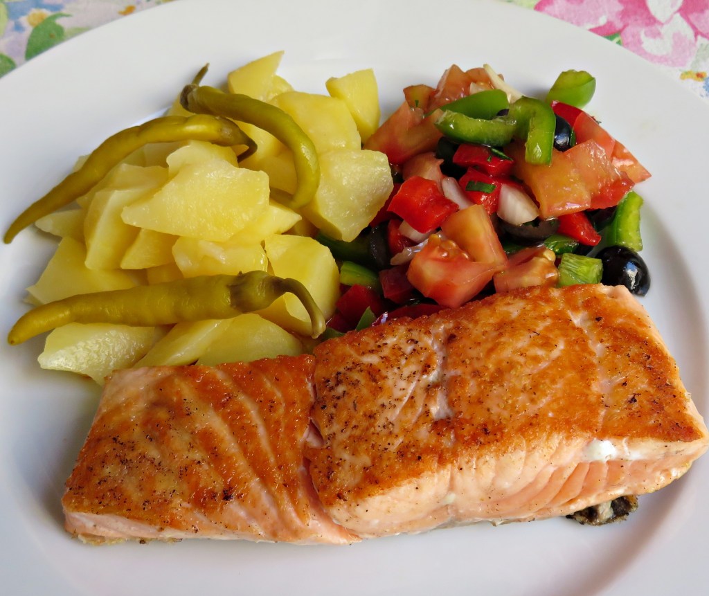 - Colocamos en la fuente los filetes de salmón, las patatas cocidas, unas guindillas enteras y la ensalada de pimientos y cebolla, piriñaca. Ah, y también los picatostes que a mi se me han olvidado en esta ocasión.