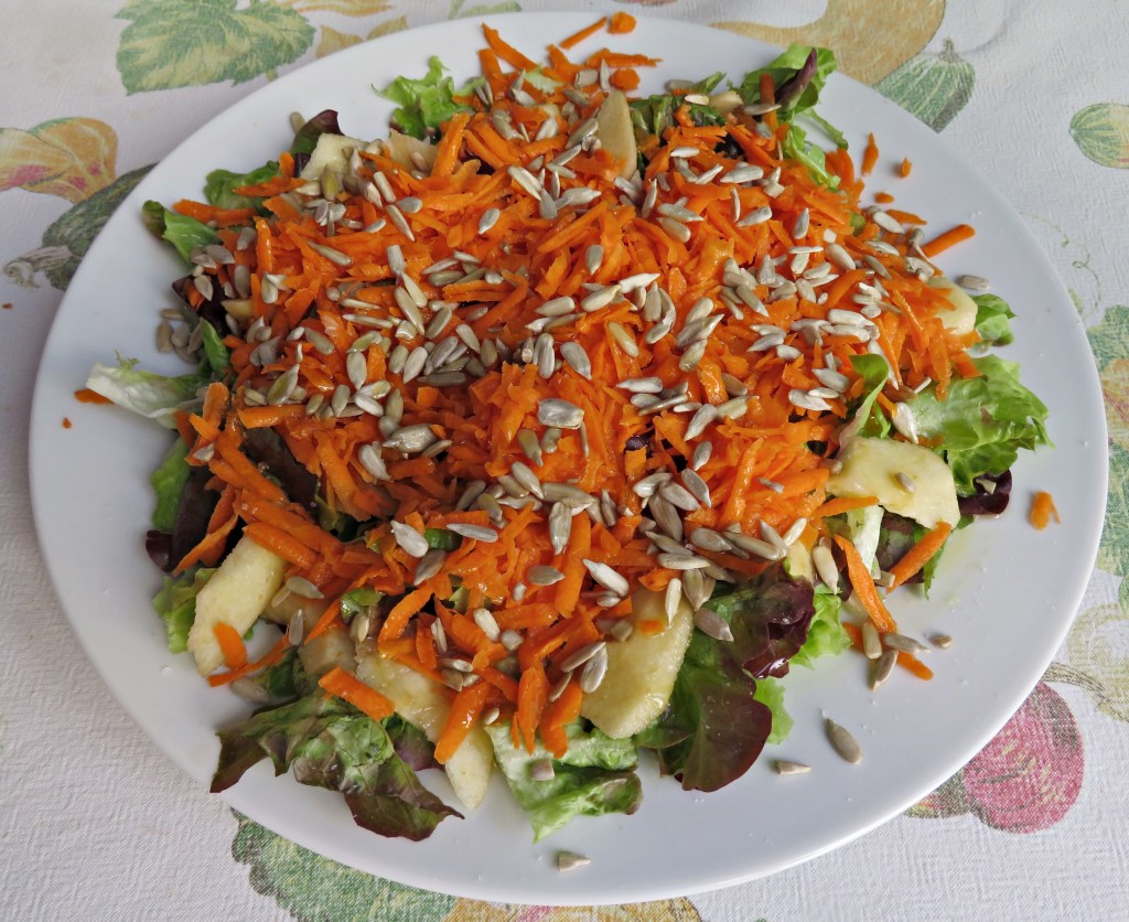 Esta ensalada de lechuga, manzana y zanahorias pertenece a Arguiñano, aunque la he preparado algo más ligera.