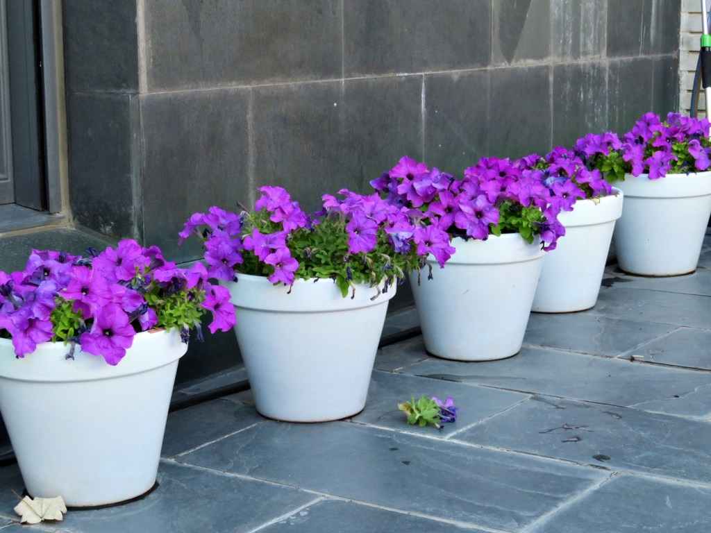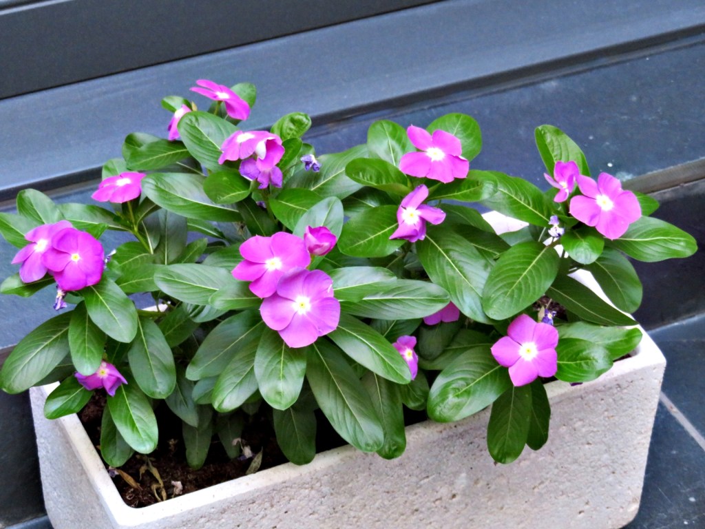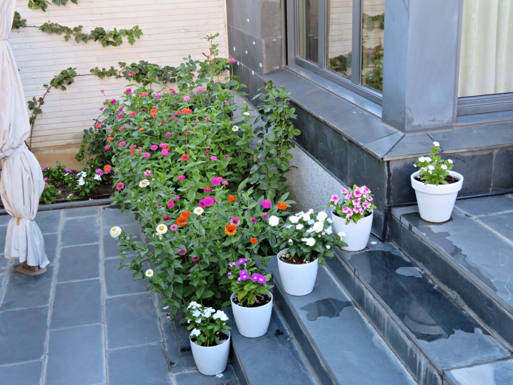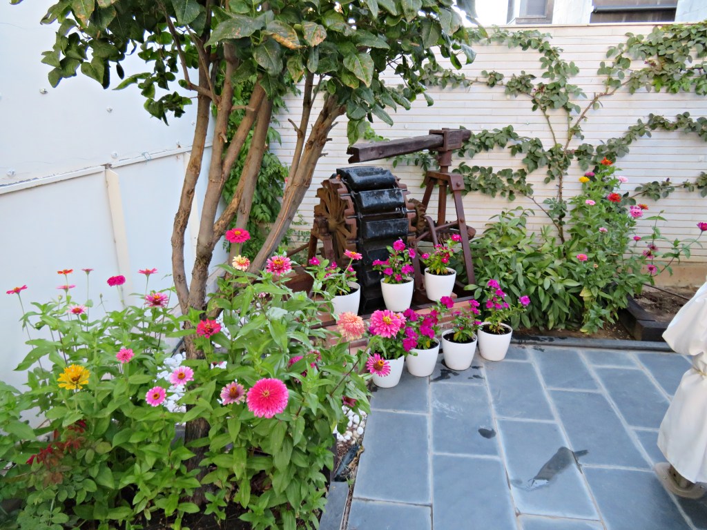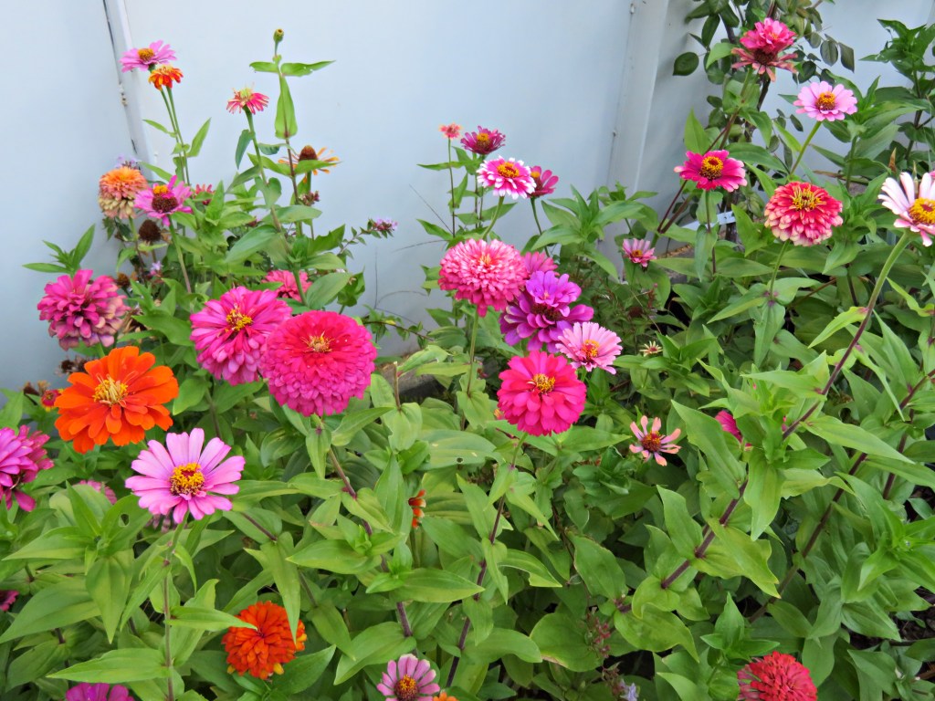 El patio exterior está repleto de flores, gracias sobre todo a las zinnias, también a las vincas, que ya empiezan a marchitarse lo mismo que las petunias.