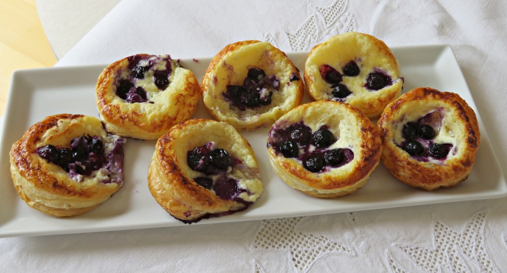 Estos hojaldres de arándanos son muy fáciles de preparar, solo hay que tener cuidado de pinchar bien el centro, para que no suban demasiado y se desparrame el queso y los arándanos como me suele suceder a mi, aunque luego los recompongo y problema resuelto. Ya, pero no es lo mismo.
