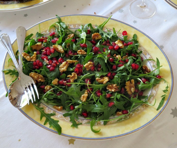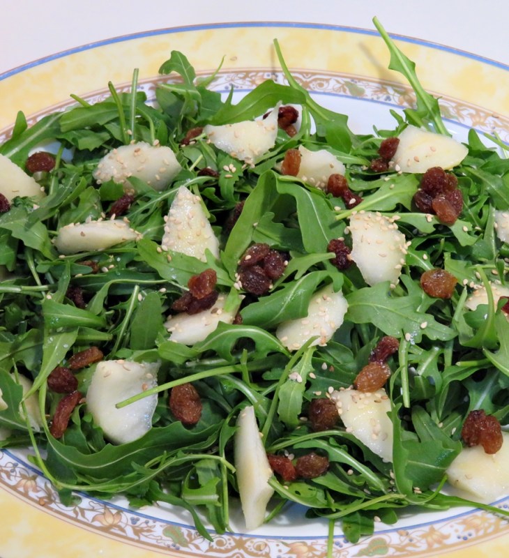 - Ensalada de rúcula con pera, pasas y sésamo.