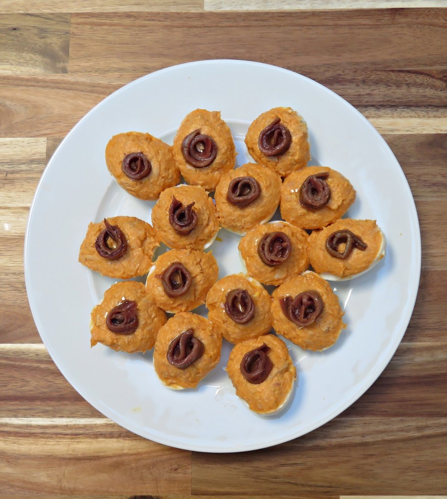 - Adornamos el huevo a nuestro gusto, con una aceituna, con un poco de sucedáneo de caviar, con una anchoa, con una tira de pimiento rojo. Imaginación.