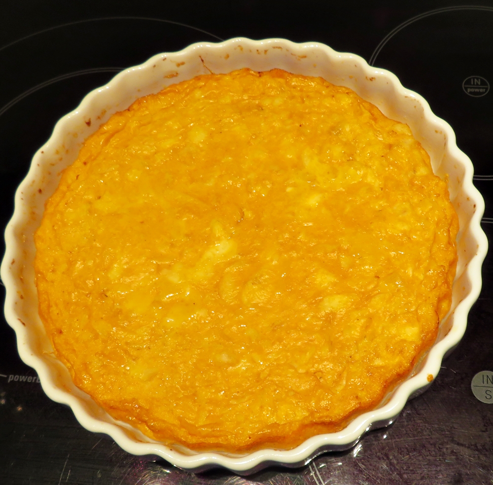 - Tenemos el horno precalentado a 180º. Metemos la fuente y la mantenemos a esa temperatura durante 20 minutos. Pinchamos con una aguja. Si sale seca, sacamos el budín. Si no es así, lo dejamos otros cinco minutos.