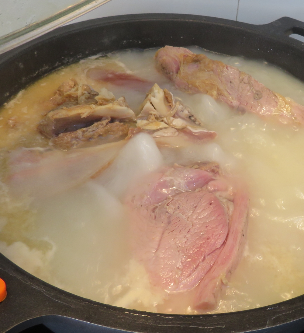 - Echamos bastante agua fría en una cazuela grande en la que ponemos a cocer la cabeza de cerdo. (Tanto la cabeza de cerdo como la panceta es opcional, pero parece que da un poco más de sabor al plato). Dejamos que cueza un buen rato.