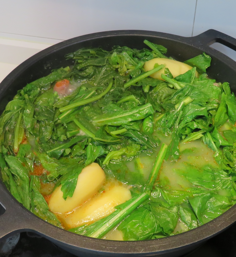 - Cuando ya se puedan pinchar, sacamos de la cazuela las carne y agregamos los grelos, bien limpios y troceados, las patatas peladas enteras y los chorizos. Ponemos por encima las carnes.