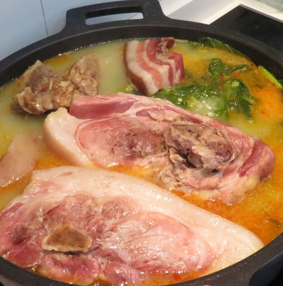 - Agregamos el lacón, partido en rodajas gruesas, y la panceta. Lo dejamos que siga cociendo.
