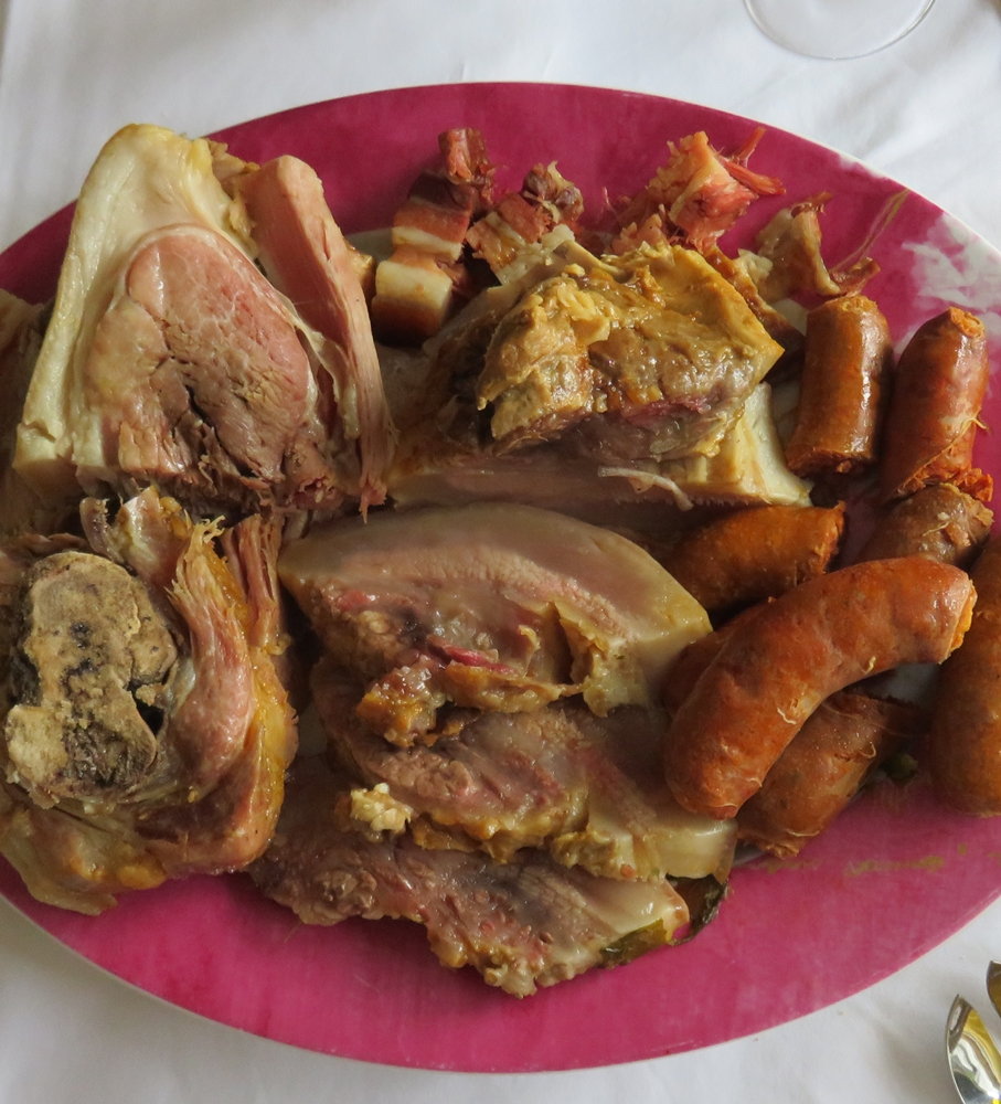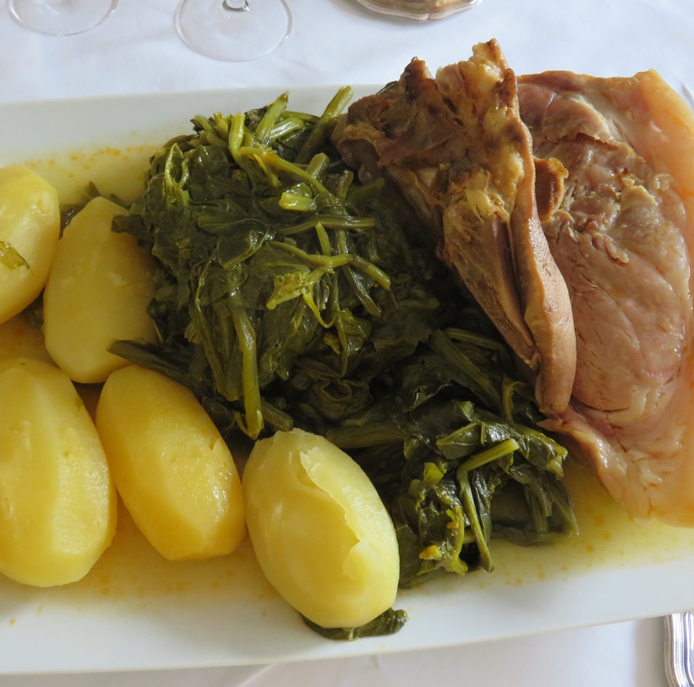 - Sacamos todos los ingredientes en fuentes y servimos un poco de cada, una cucharada de grelos, una patata, un trozo de cabeza, otro de lacón, panceta y chorizo, en los platos de servir.