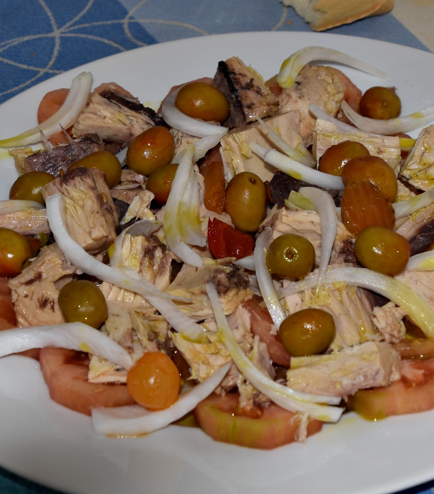 - Aliñamos con aceite, un poco de vinagre, si el bonito fuera en aceite y sal.