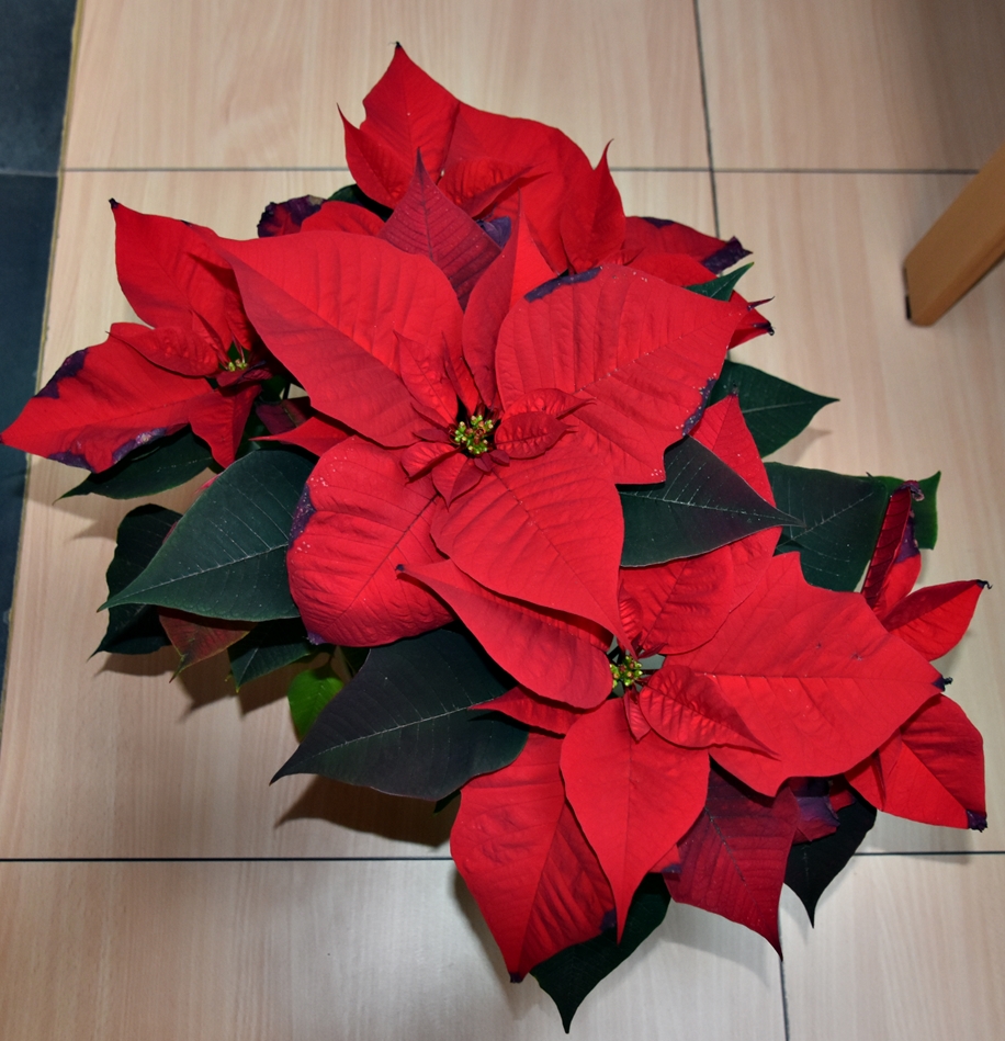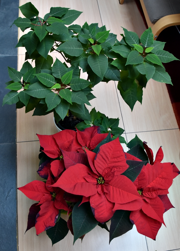 Como todos los años, nos han regalado una Flor de Pascua, aquí está, en compañía de la del año pasado, que ha sobrevivido los 12 meses pero no ha florecido.