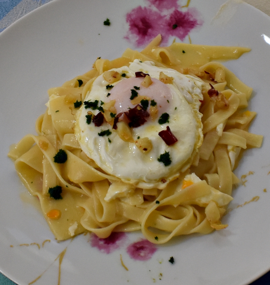 Hace un tiempo, un día que no tenía nada preparado para comer, no tenía ganas de cocinar y además estaba sola, pensé en la pasta y huevos, ¿qué tal quedarían juntos? Busqué por internet y hallé esta receta de pasta con huevos fritos, en #RecetasComidista. ¡Qué rabia, parece que no queda nada en este mundo que no esté ya inventado!