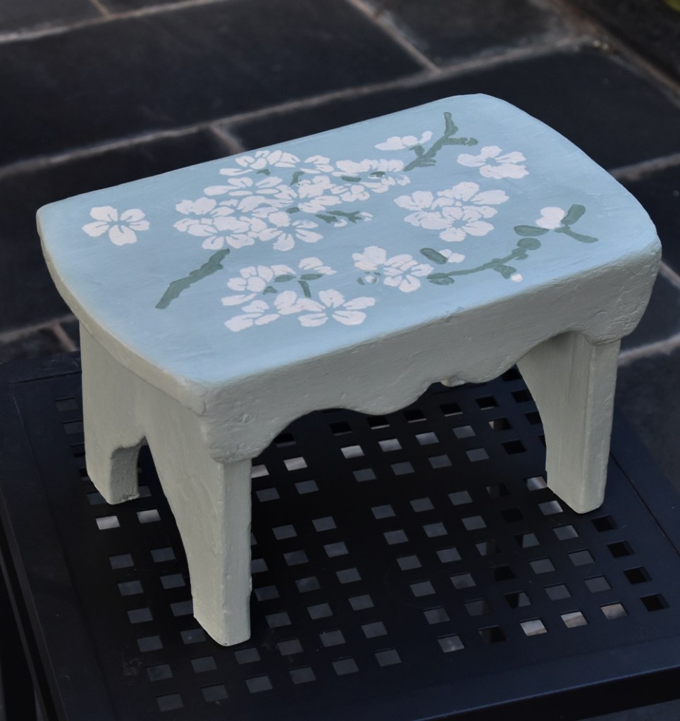 Una práctica de recuperación y pintura. Sobre un pequeño taburete. Pintura a la tiza y unas flores de cerezo, con plantilla, claro. Aprender. El color de verdad que es verde, para más datos, verde laurel. Un color muy provenzal.