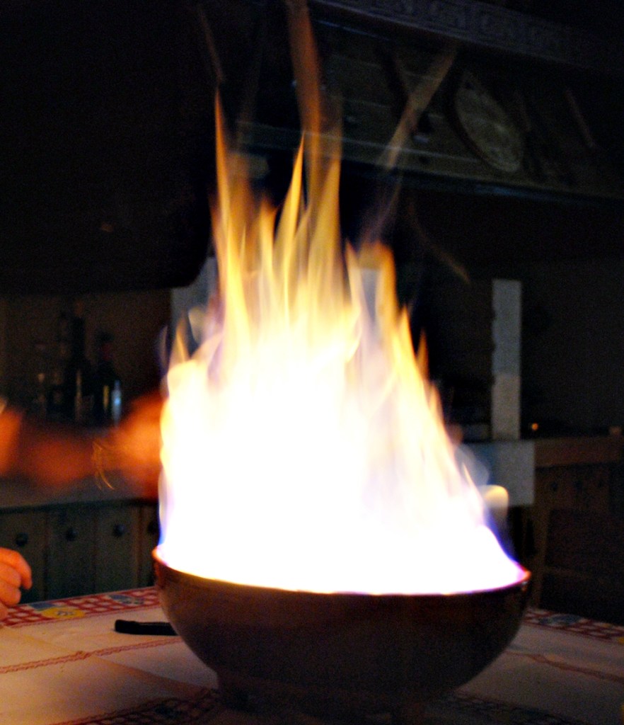 Su preparación es muy sencilla y sirve para provocar unas cuantas risas a quienes se reúnen en torno a un cuenco en llamas, quemando alcohol.