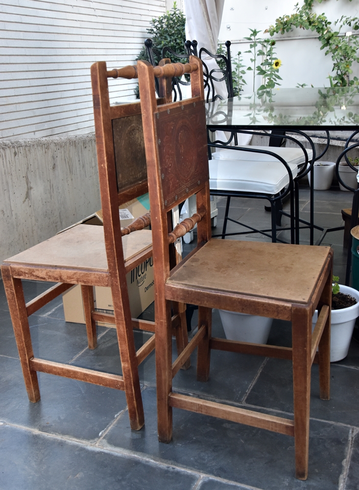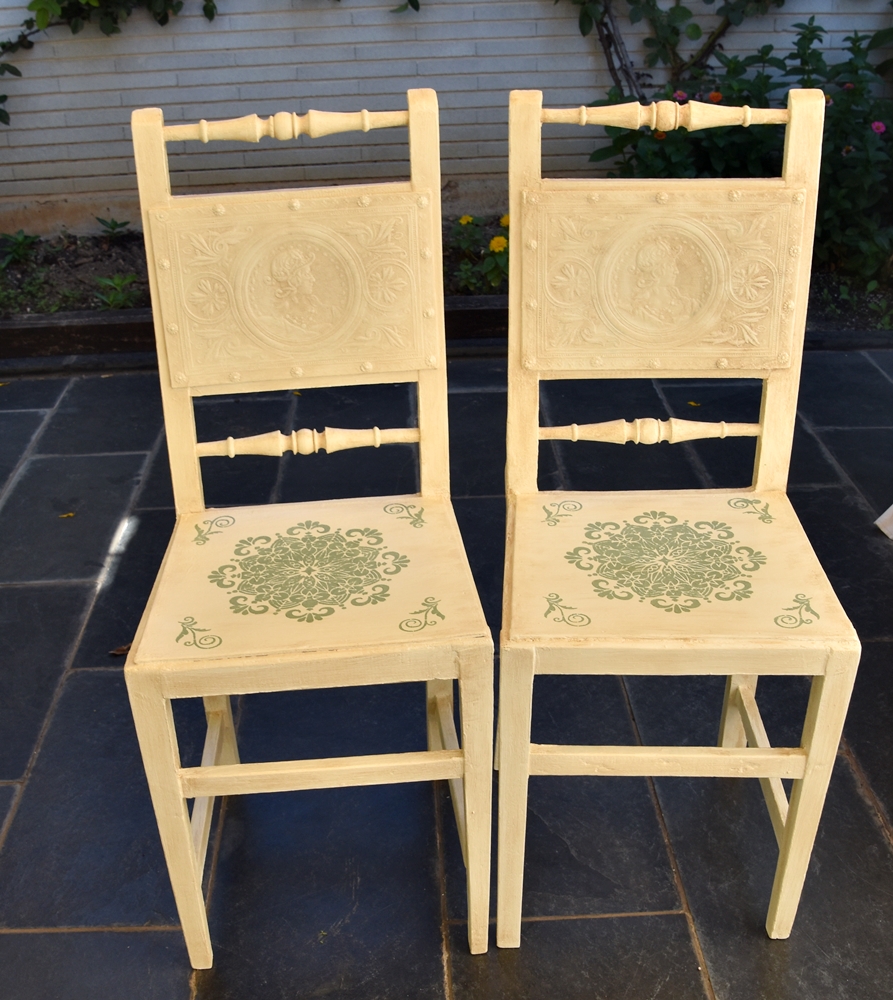Dos sillas con carcoma, descoloridas. Las he pasado a color crema, envejecidas con cera y un dibujo en el asiento en verde laurel. No han quedado mal. Por supuesto, son mejorables.