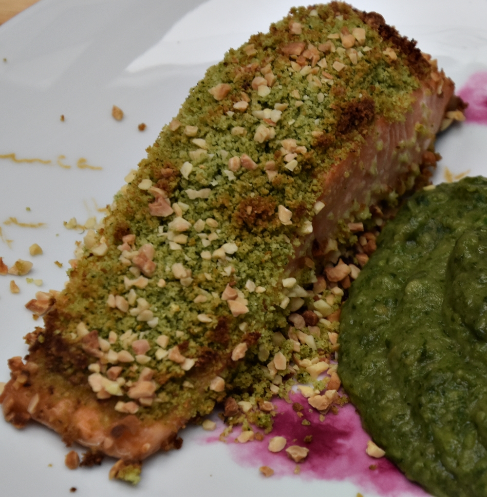 Esta receta de salmón en costra con puré de espinacas la he sacado de Thermomix, con alguna variante, claro. El salmón, muy rico, el puré totalmente prescindible, está bien, pero se puede acompañar con cualquier otra guarnición.
