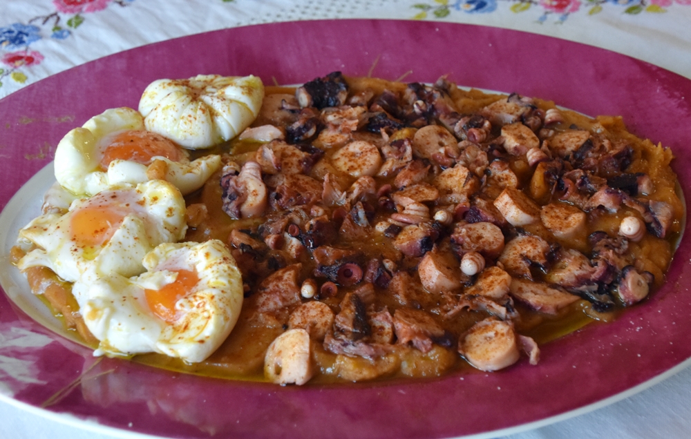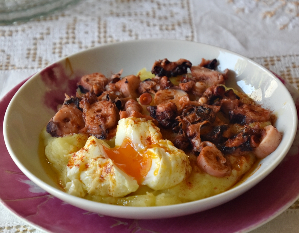 Se trata de una base con patatas revolconas, sin tocinillo, con pulpo a la gallega por encima y coronado con un huevo flor, como los que hace Arguiñano, que quedan estupendos. Thermomix también tiene un plato parecido pero sin huevo, con panceta.