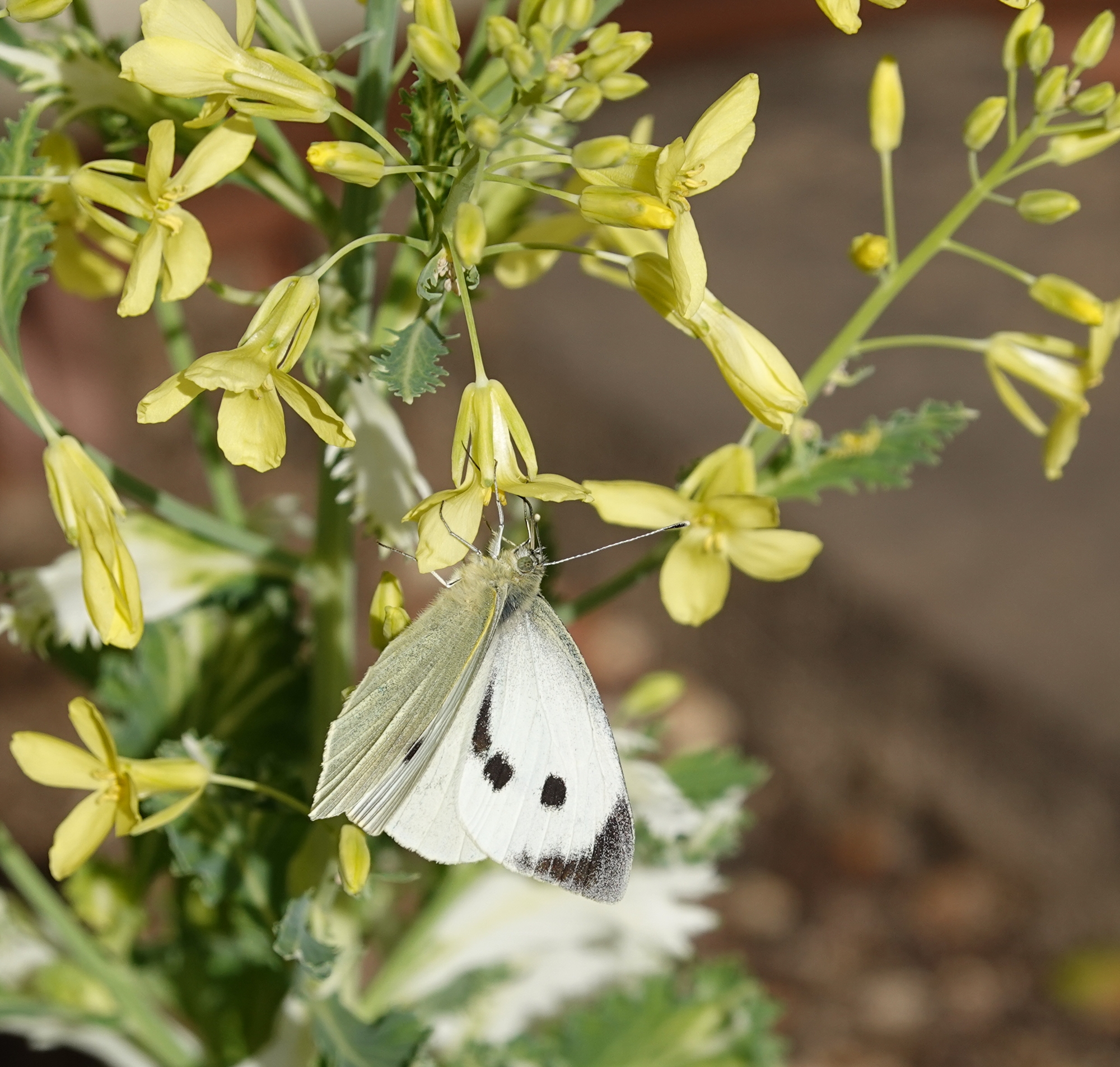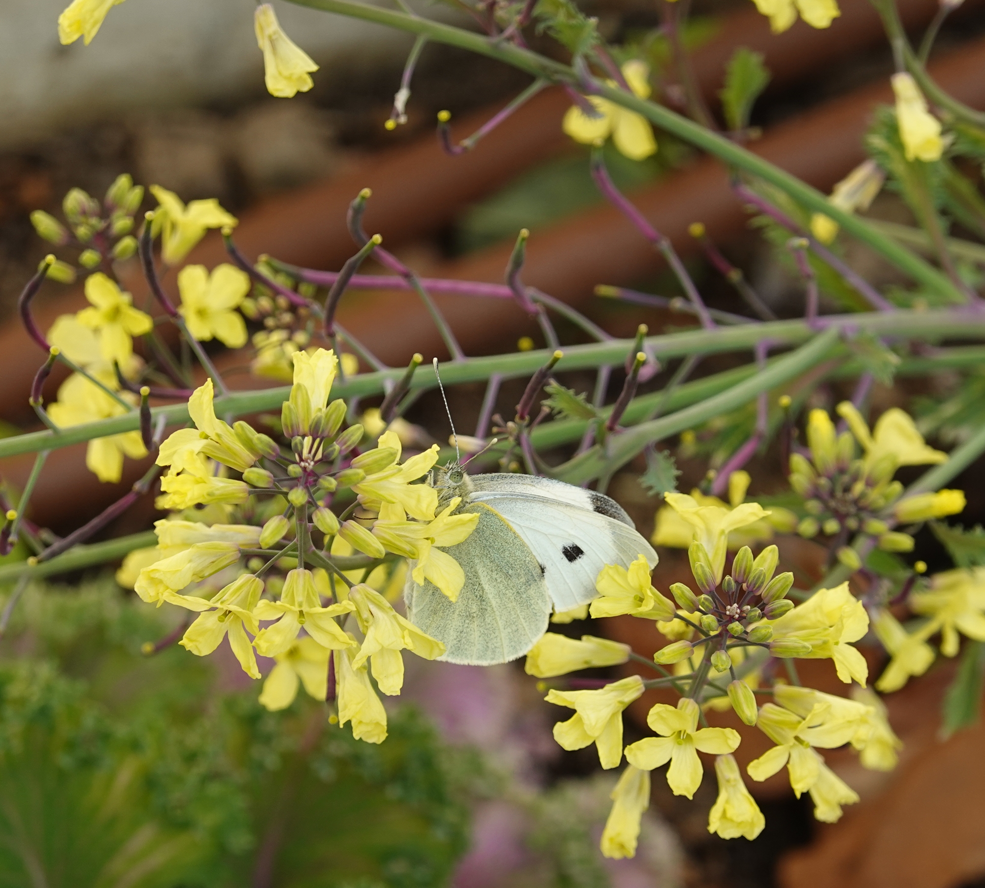 Nada de lilas, la intensa poda a la que fue sometido el árbol, solo ha podido echar algunos brotes. Es también, el final de las coles ornamentales, eso si, con una mariposa blanca revoloteando.
