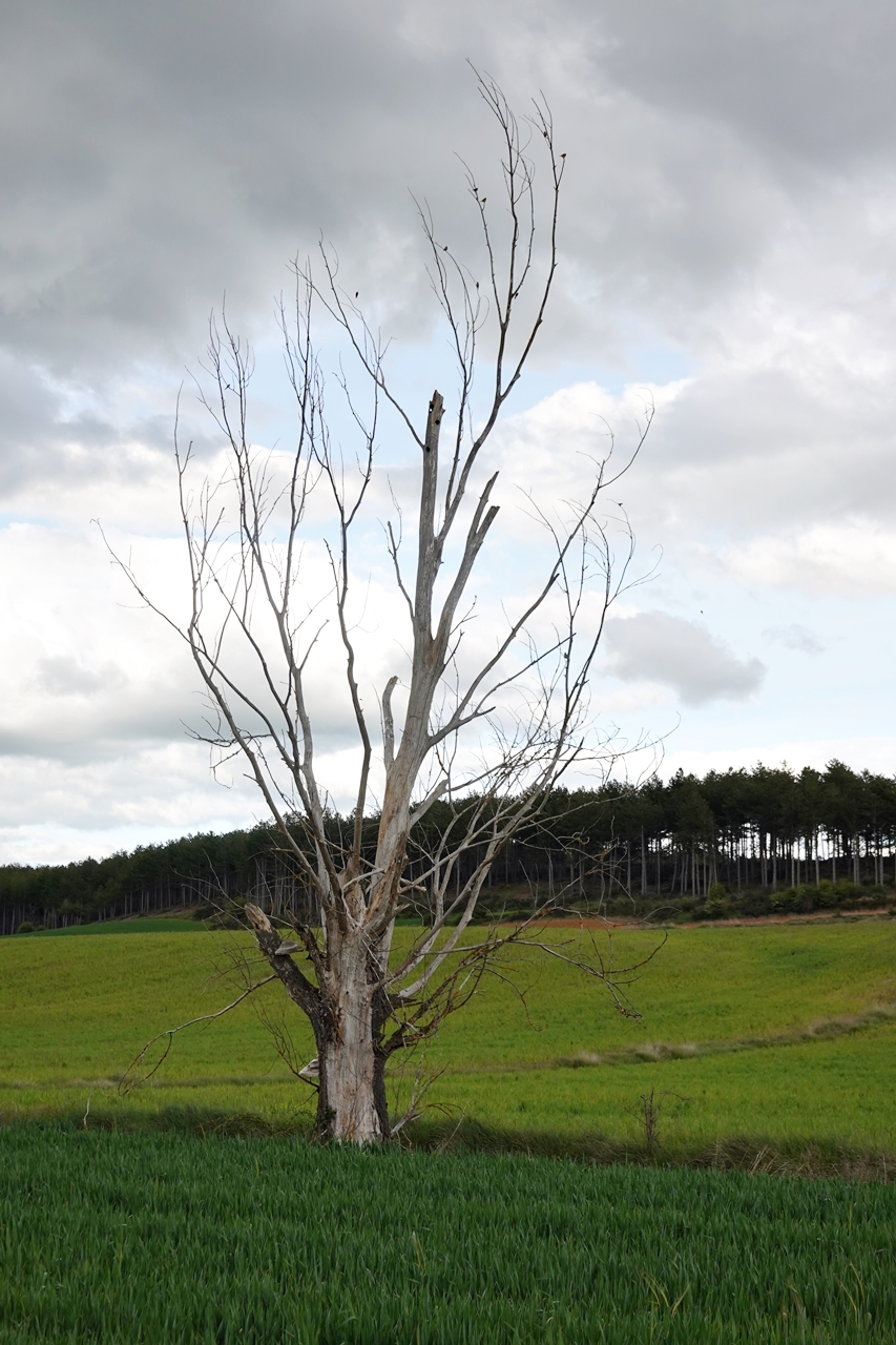 En medio, un árbol seco permanece como una escultura en medio del cereal verde.