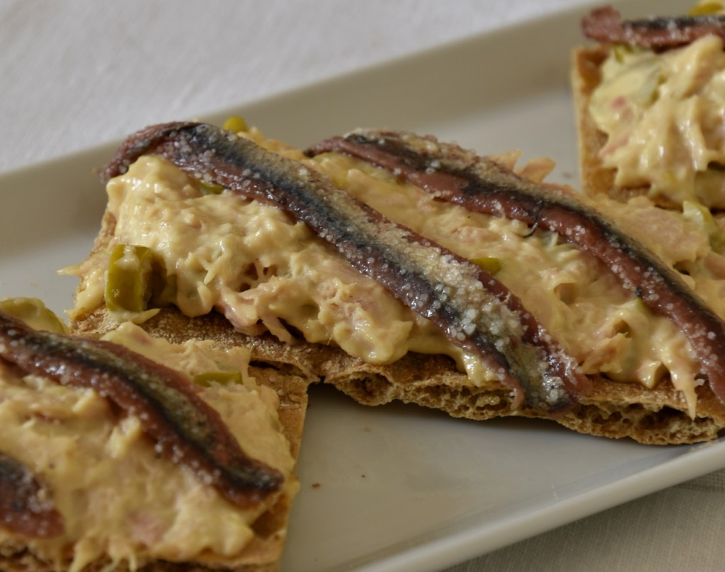- Colocamos una buena cantidad sobre una rebanada de pan wasa. Adornamos con dos anchoas, que habremos secado con papel de cocina.